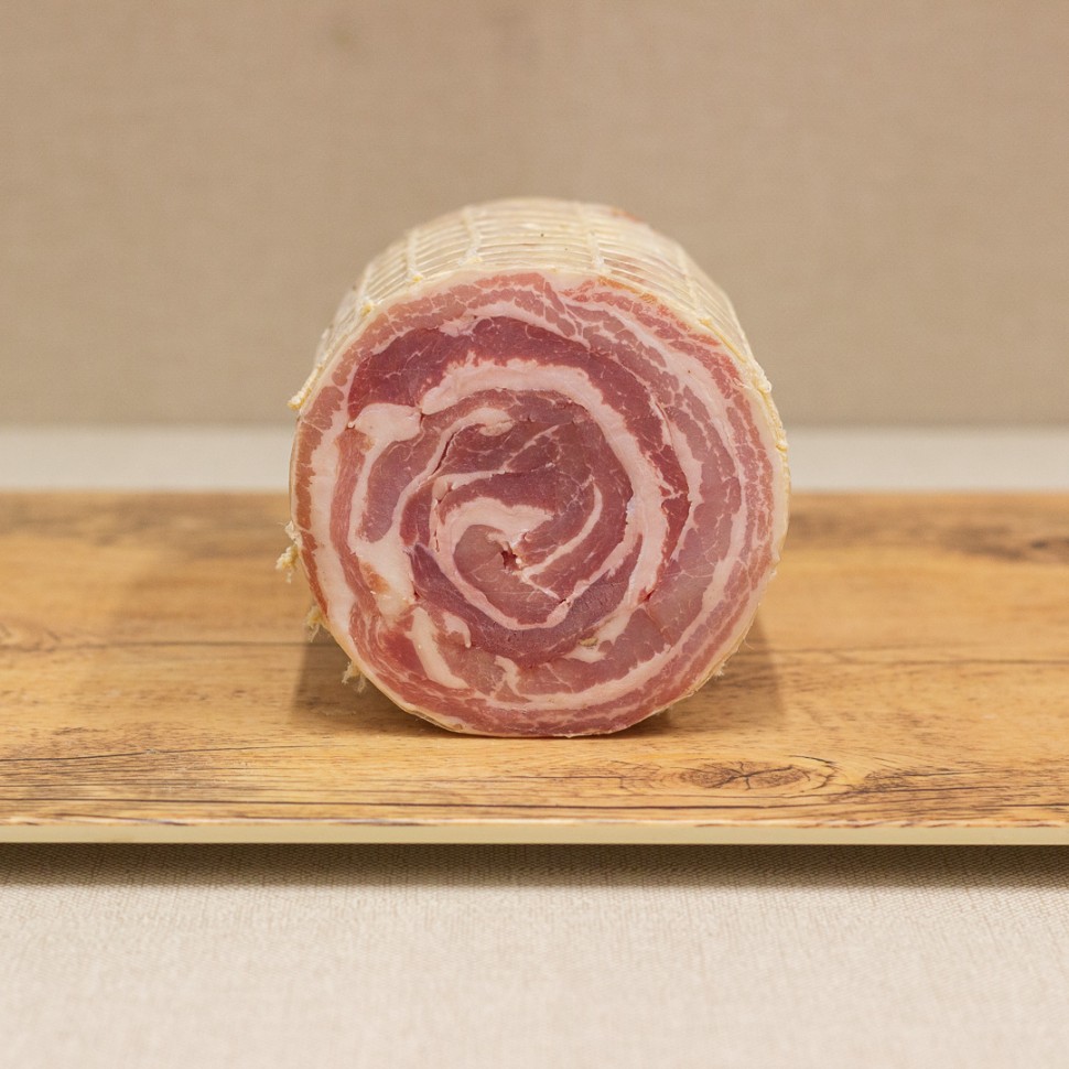 Prodotto insaccato in budello artificiale, pancetta di suino privata della cotenna e arrotolata.